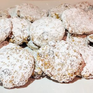 3. Mit einem Löffel kleine Kugeln formen, platt drücken und in Puderzucker wenden. Tipp: Beim Kugeln formen schon Puderzucker verwenden. Die Masse klebt sonst sehr stark.