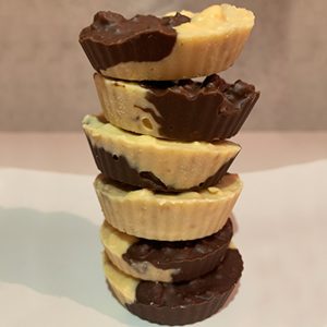 2. Die Zartbitterschokolade und die weiße Schokolade jeweils in einer Schüssel zum schmelzen bringen. In jede Schüssel 50g der Erdnussbutter und 50g der Keks-Brösel geben und gut verrühren.